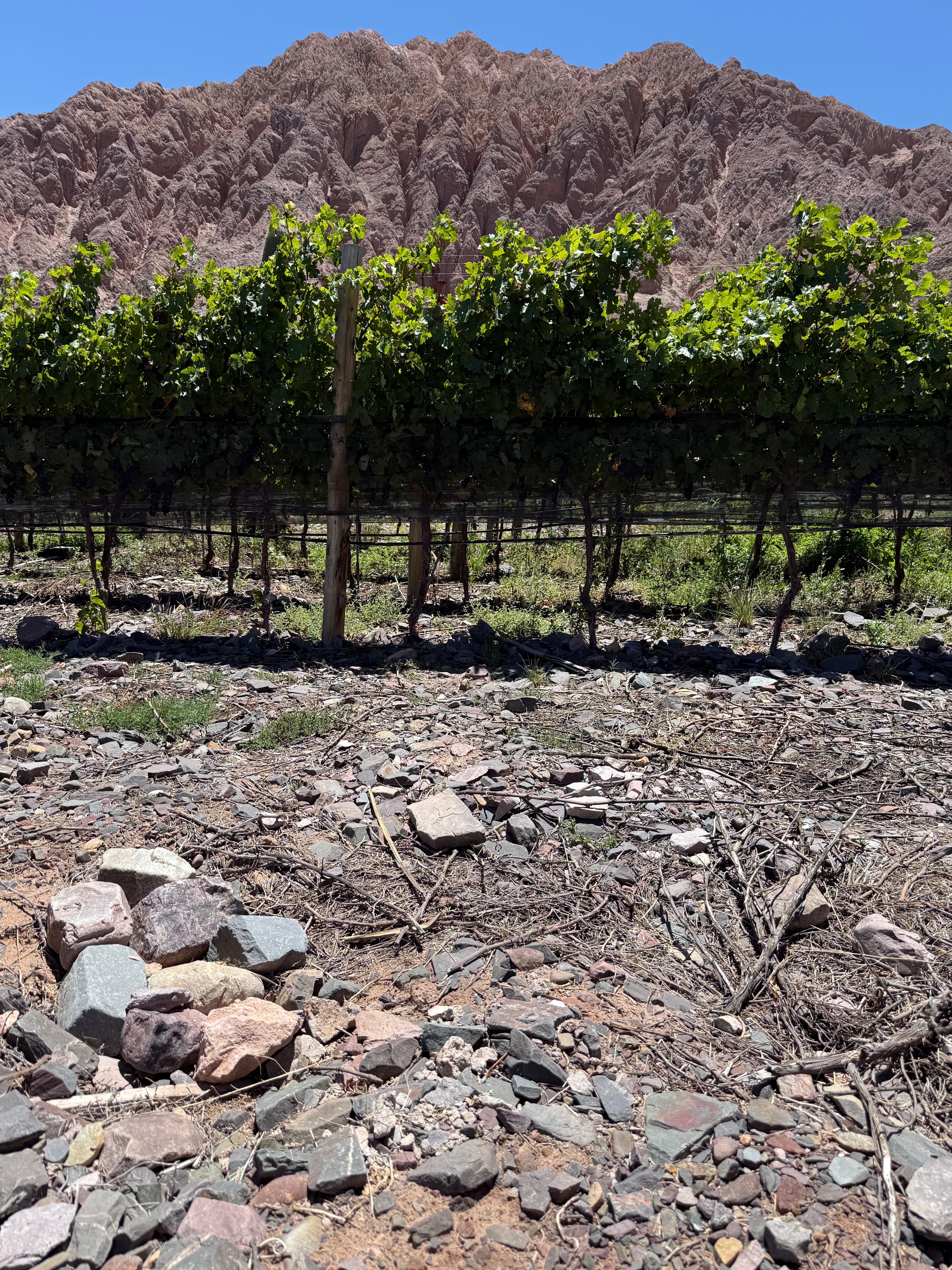 After empanadas, we drove to the vineyards nearby. Looking up, we could see the Quebrada de Humahuaca, declared an Unesco site in 2003. Looking down, we could see soil covered with galet roules stones - A surreal sight. Ulises is growing Rhone varietals, the soil makes sense for them. His Grenache blew me away. It tasted unlike any I’ve ever had - Plants and herbs on the nose, with a grainy tannin on the palate….as if tasting the dessert of Jujuy. The fruit was fresh and lifted but also you could taste notes of umami.